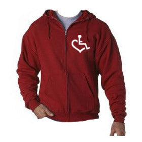 Red Heart Hooded Zip-Up.Tell everyone that you embrace and love life. Spread the conversation of social acceptance of disability with this hooded pullover!. Our trademarked International Symbol of Acceptance ("wheelchair heart symbol") boldly displayed over your heart.